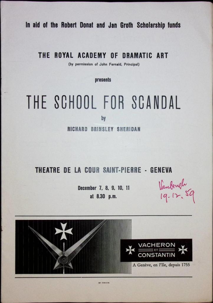 By his second year at RADA, John Thaw was honing his craft as he performed in many student productions. His name can be seen on this programme for a 1959 production of Sheridan’s The School for Scandal. A reviewer in The Stage described his performance in the role of Snake as “convincing”. John attended RADA from, 29 September 1958 – 23 July 1960.