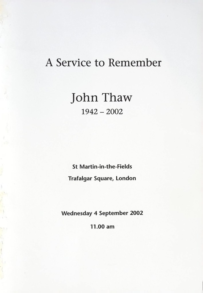On Wednesday 4 September 2002, A Service to Remember John Thaw was held at St Martin-in-the-Fields in London. This memorial was attended by family, friends, professional colleagues, a number of John’s fans, and the then Prince of Wales, Charles. Trafalgar Square came to a standstill as John’s grandchildren released 60 balloons, one for each year of John’s life, bearing the message, “Today we remembered John with love”.