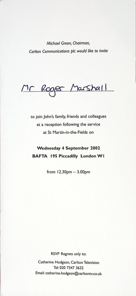 [This has been scanned from the copy belonging to screenwriter Roger Marshall, who worked closely with John on several projects, and was amongst the friends and colleagues who attended the memorial service. It was very kindly donated by his son, Rodney Marshall, to be shared with John’s fans on this website.]